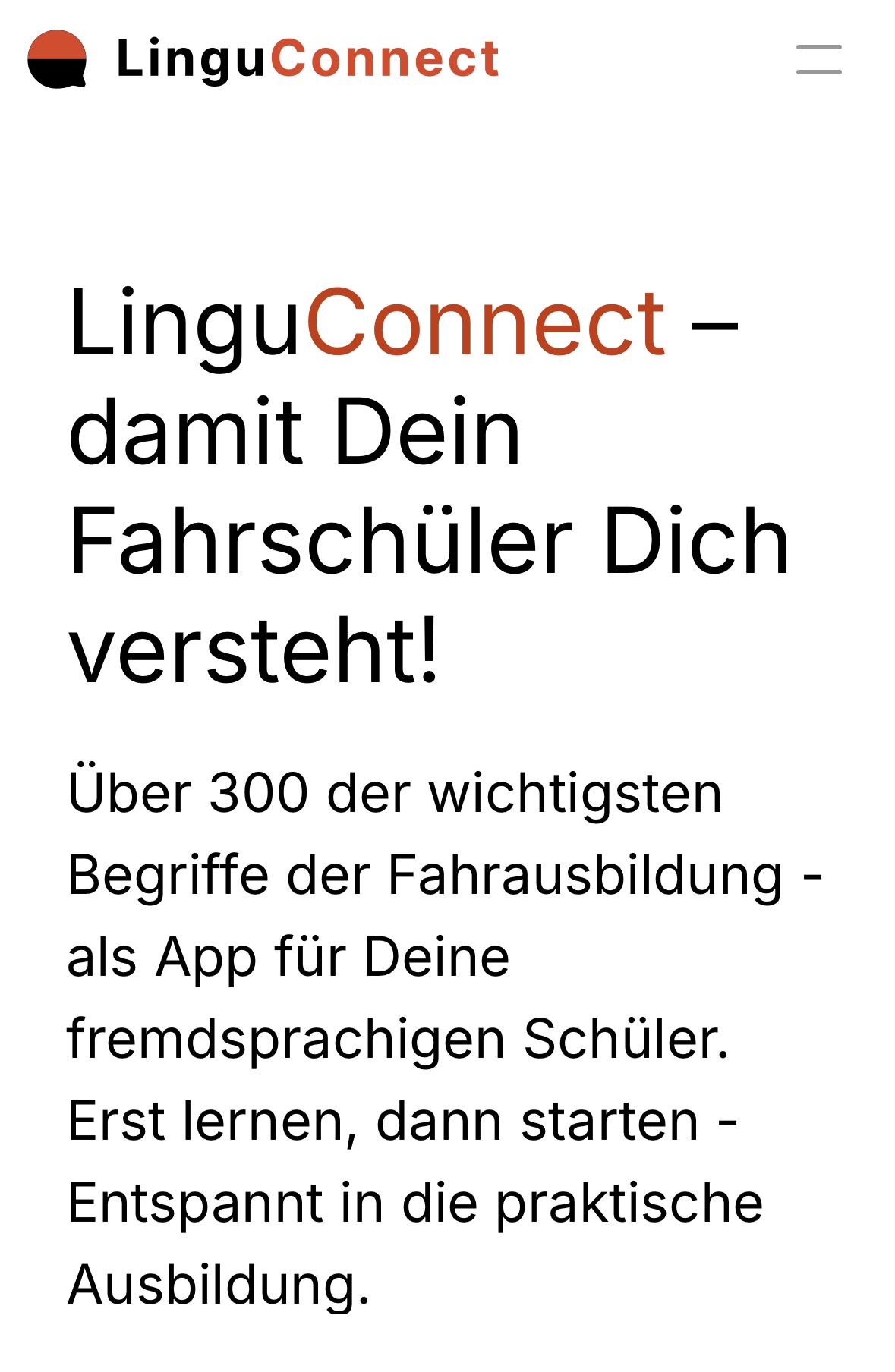 LinguConnect ist eine fertig entwickelte Lern-App für Fahrschüler mit wenig bis keinen Deutschkenntnissen, die Sprachbarrieren in der praktischen Ausbildung überbrückt.